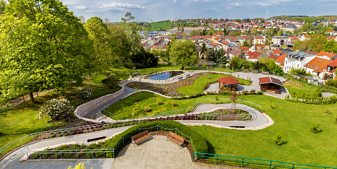 Die Wege sind auf verschiedenen Höhen mit Aufweitung als Sitzzonen versehen, von denen aus die Bewohner einen schönen Blick auf die Stadt Meerane genießen können. Begleitend zu den Wegen wurden Beete mit einer Vielfalt an Pflanzen angelegt, die den Garten zu allen Jahreszeiten attraktiv gestalten.