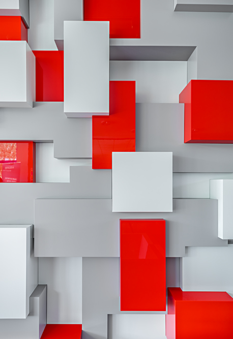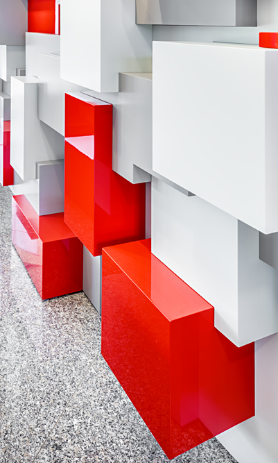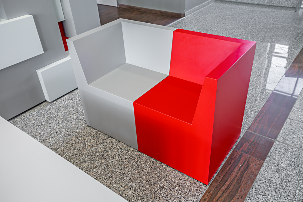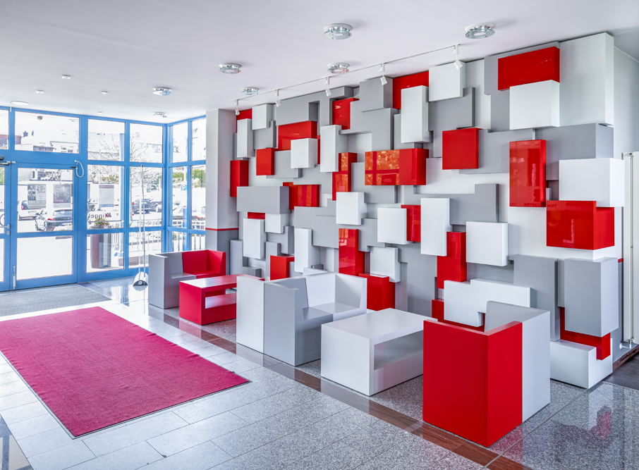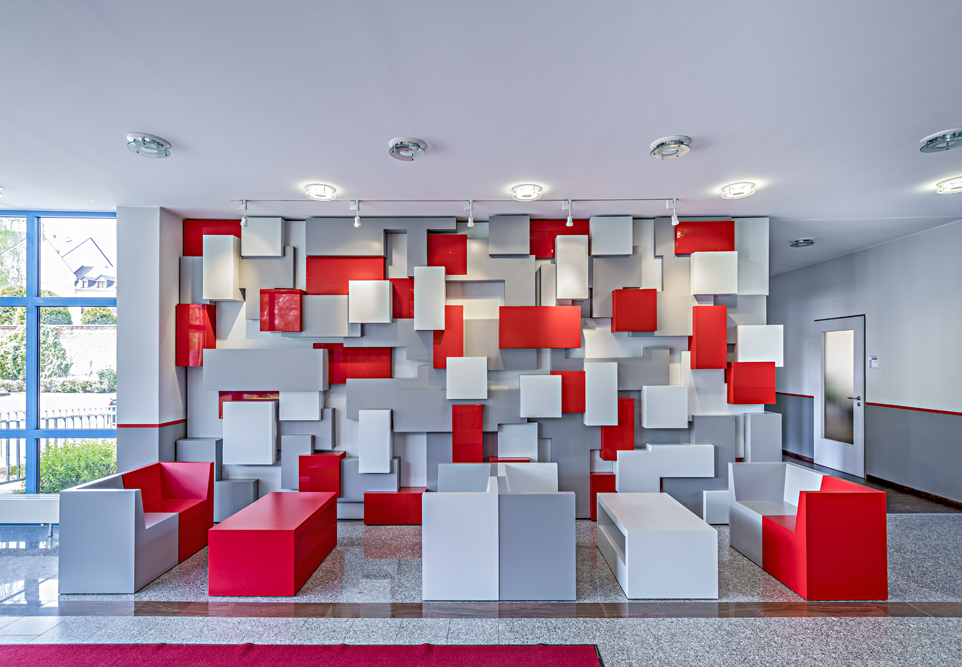 Jeder Würfel steht für eine bestimmte Aufgabe. Die Konstruktion dieser Würfel erfolgt in der Weise, dass sie bis zur Bildung eines Gefüges von Lösungen zu den Aufgaben zusammengesetzt werden. Die im Foyer befindliche Würfelwand veranschaulicht symbolhaft den kontinuierlichen Prozess der Bewältigung anstehender Aufgaben, um die selbstgestellten hohen Ansprüche zu erfüllen. Im Rahmen der Möblierung des Servicebereichs sowie der Sitzmöbel im Foyer wurde das Design entsprechend übertragen.