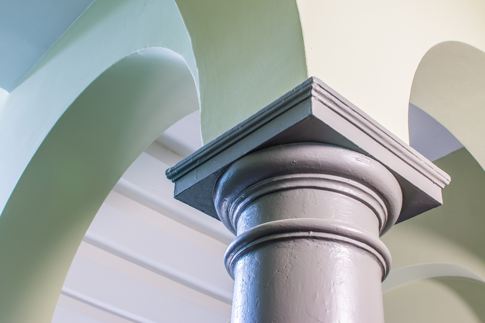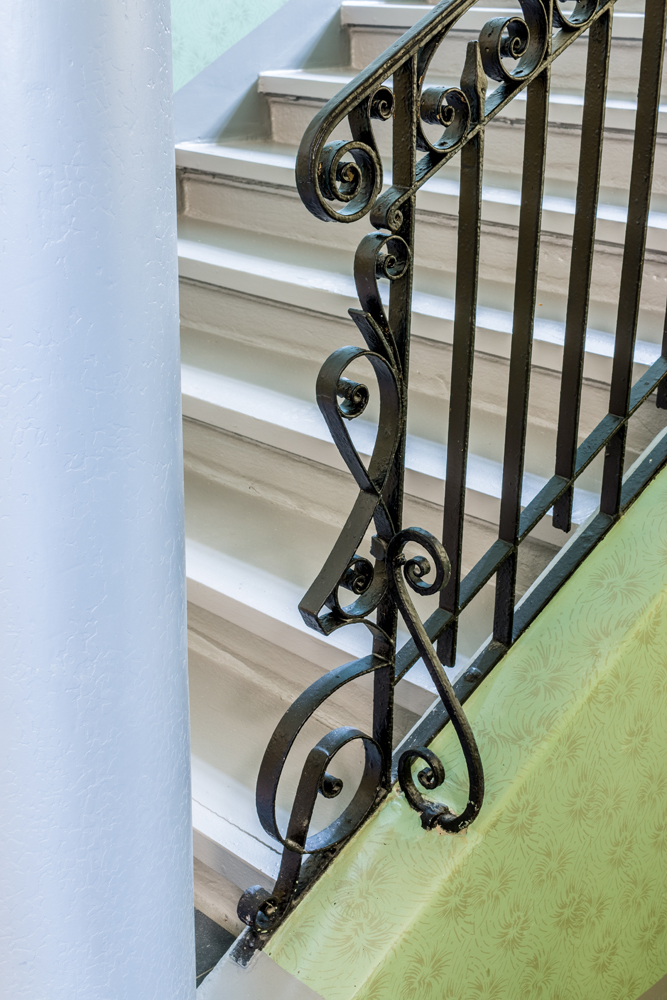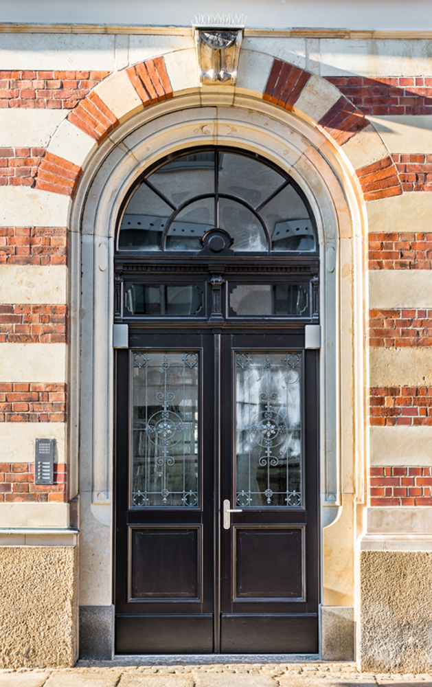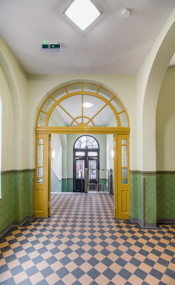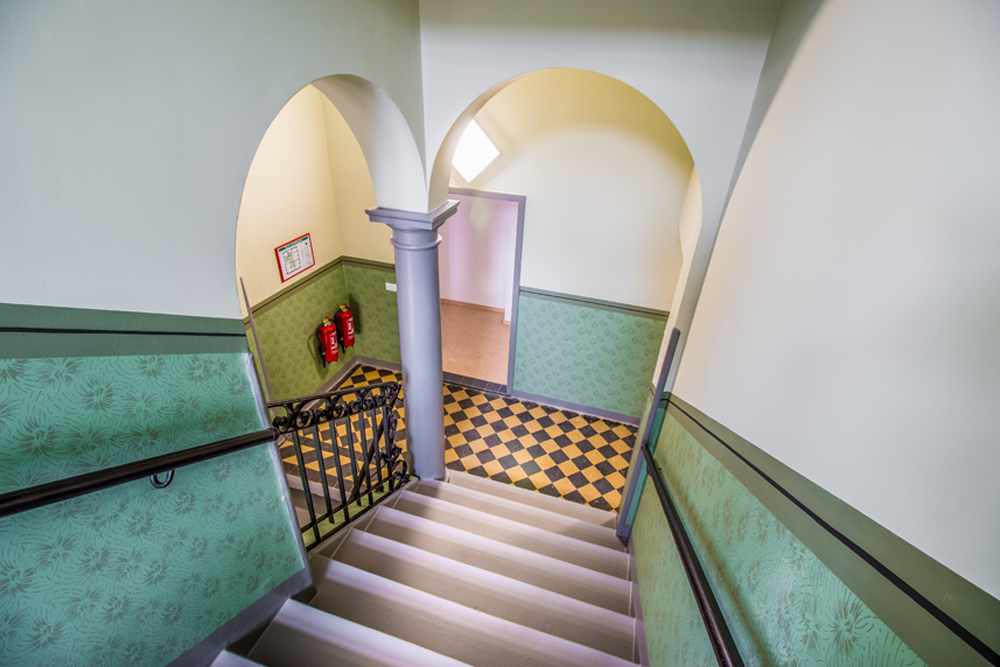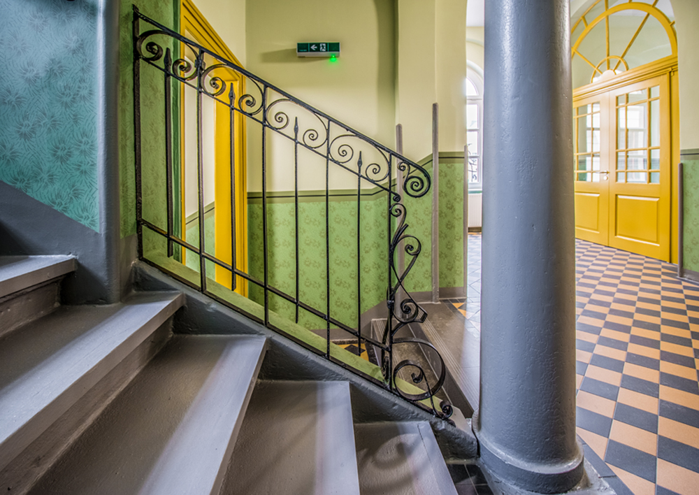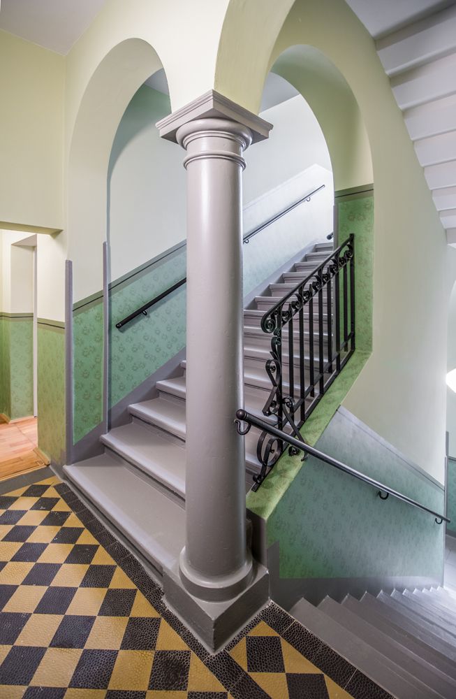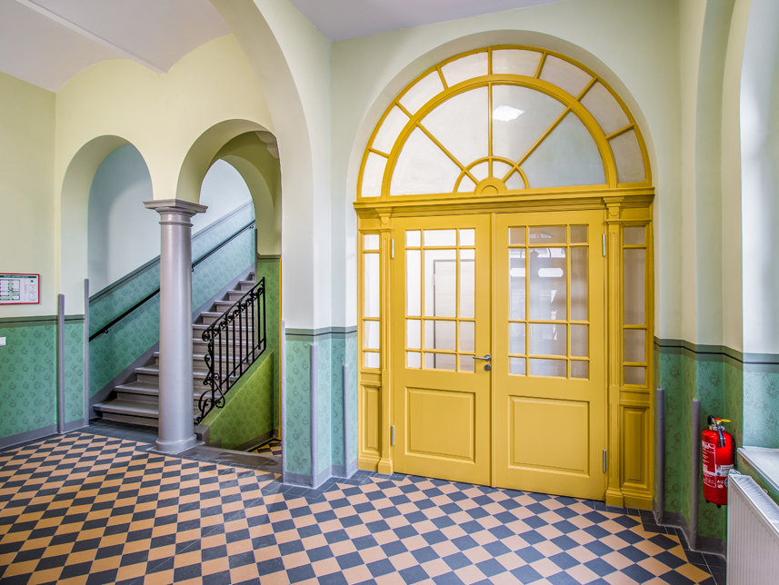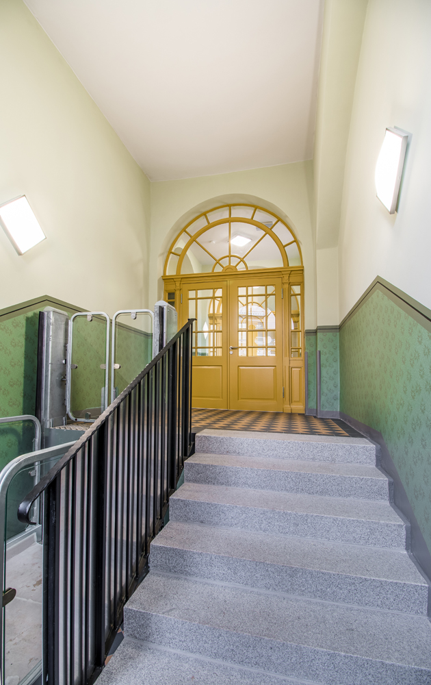Das Farb- und Materialkonzept wurde in den Bereichen des Windfangs, der Eingangshalle sowie des Treppenhauses auf den Erhalt des historischen Erscheinungsbildes hin ausgerichtet.