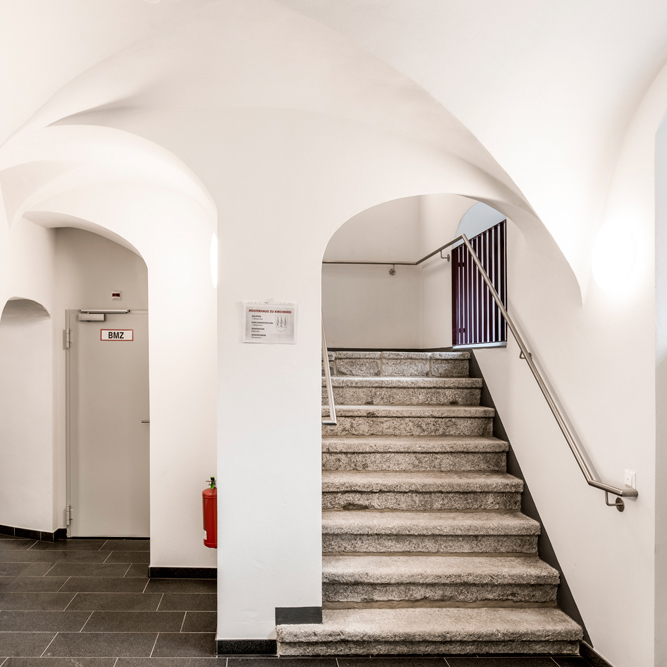 Dem öffentlichen Charakter des Gebäudes Rechnung tragend, wurde dem Gebäude ein moderner und in der Gestaltung kontrastierender Anbau zur Aufnahme der barrierefreien vertikalen Erschließung mittels modernen Personenaufzugs hinzugefügt.