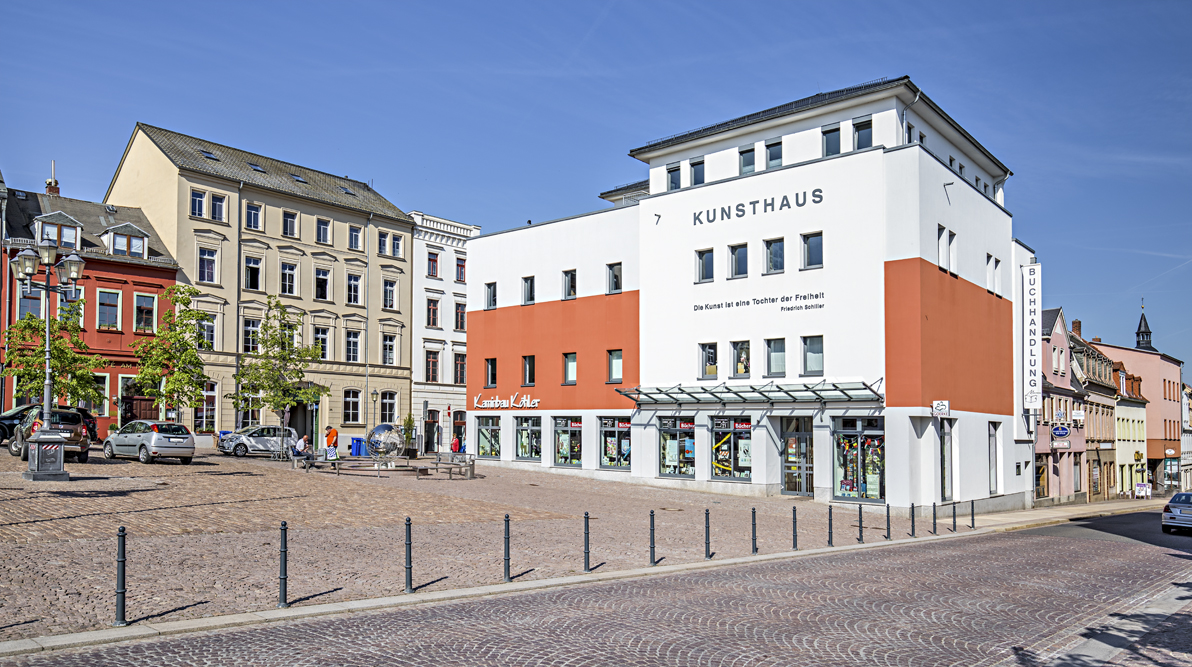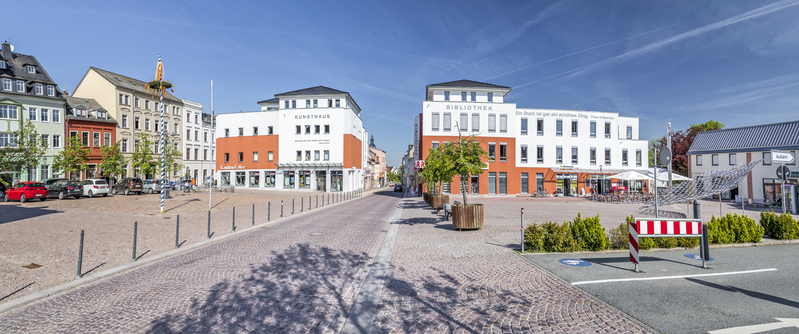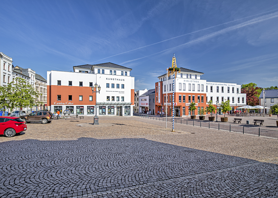 Neue Stadtbibliothek "Zur 49" und neues Ausstellungsgebäude "Kunsthaus" am Markt in Meerane