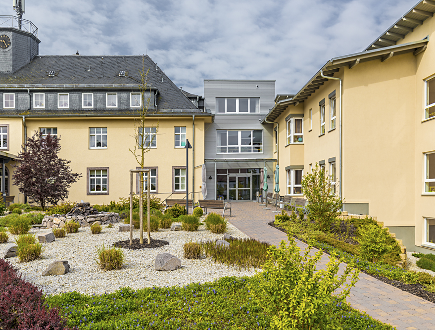 Das neue Gebäude wurde analog zum Bestand in Hanglage errichtet und verfügt über vierunddreißig Einzelzimmer, die sich auf drei Etagen verteilen. In jedem Stockwerk sind Räumlichkeiten für die Pflege und das Personal integriert. Des Weiteren befinden sich im Erdgeschoss zwei Gemeinschaftsräume, die durch eine mobile Trennwand miteinander verbunden und als Veranstaltungsraum genutzt werden können.