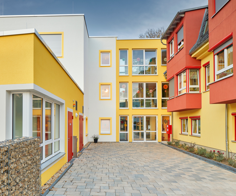 Von außen ist die Nutzung gut ablesbar. Der Neubau gliedert sich in einen dreigeschossigen Baukörper mit jeweils einer Wohngemeinschaft pro Etage.