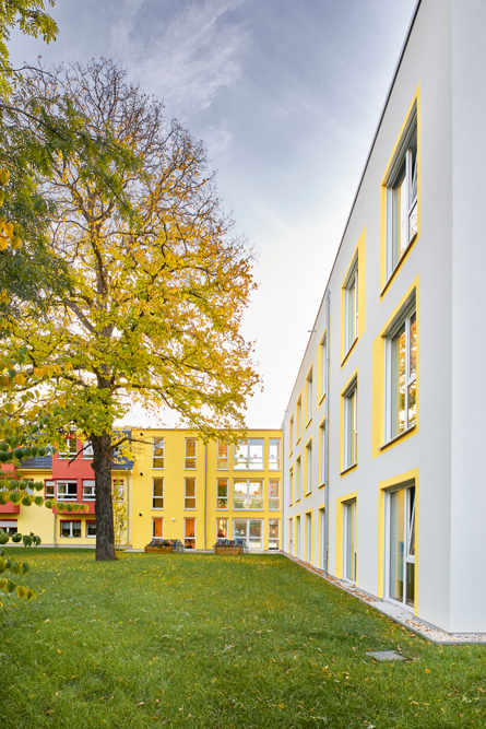 Der neue Baukörper hat eine moderne, klare Formsprache und ist farblich dem Bestand gegenüber farblich dezenter gehalten. Die Nutzung des neuen Gebäudes ist gut strukturiert.