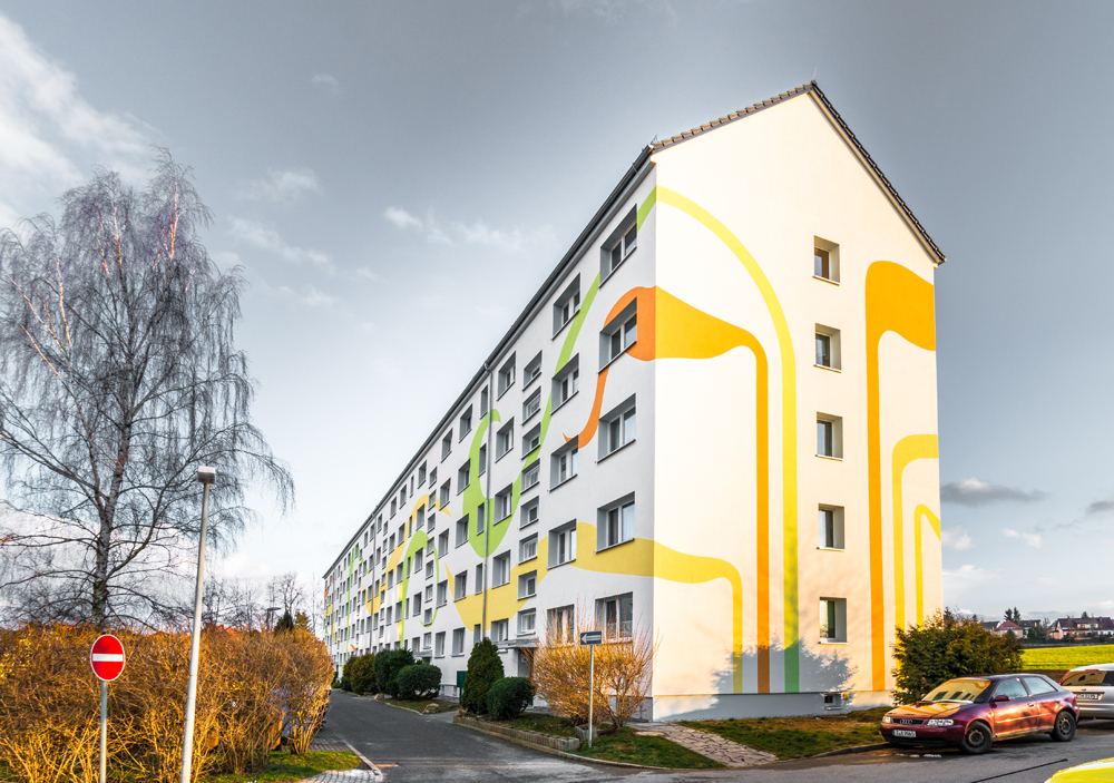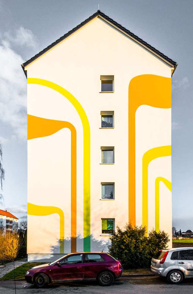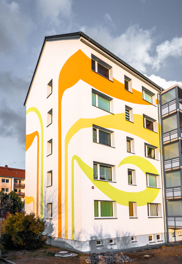 Nach Abschluss der energetischen Sanierung des Gebäudes äußerte der Bauherr den Wunsch, die Fassade in einer Weise zu gestalten, die sich von der üblichen, aus einer Vielzahl von Farbtönen bestehenden Fassadenansicht deutlich unterscheidet und bereits aus großer Entfernung Aufmerksamkeit erzielt.
